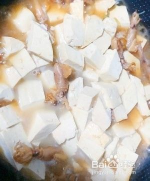 放豆腐,加盐,倒热水,先大火烧开,小火炖5分钟。