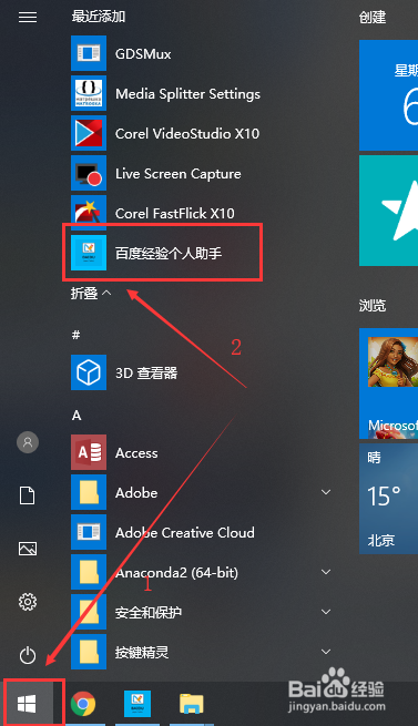 然后左键单击电脑左下角的图标,找到百度经验个人助手打开即可