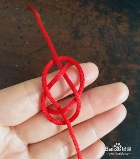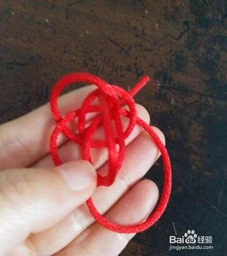 我们再把下边右侧的红绳拿起从食指上中间的红绳底下穿过去,拿开手指看,就像是一个8字。