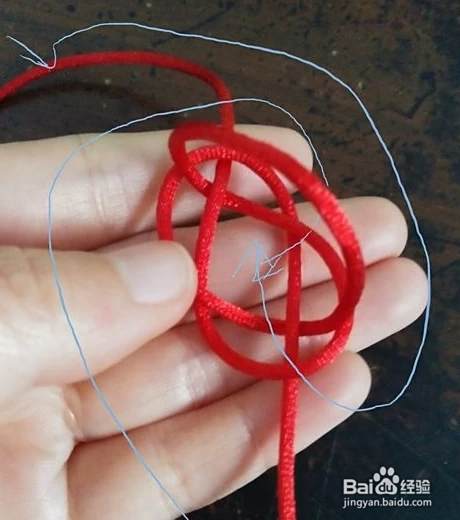 这样就形成了一个套。我们把大拇指上的套拿下来放在食指的红线上,用拇指按住。