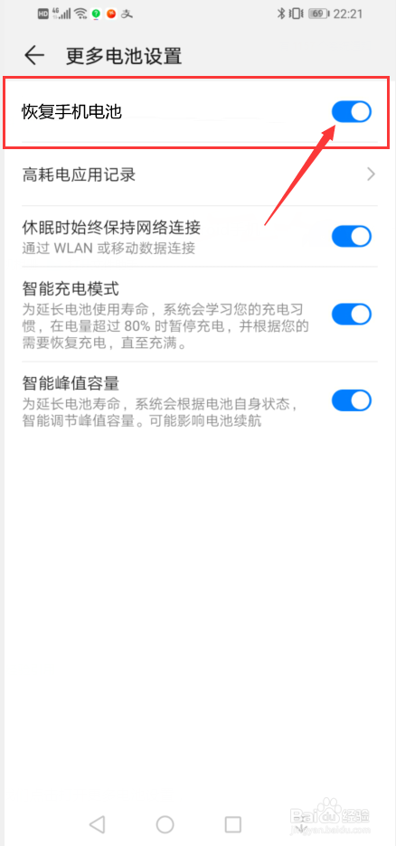最后,我们将恢复手机电池的开关给打开,就可以解决问题了。