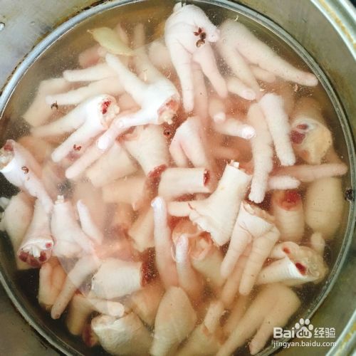 煮鸡爪,冷水下锅,放四片姜,料酒和五粒花椒,这样可以去腥,水开了煮十分钟,筷子扎的时候能轻松扎透了即可!