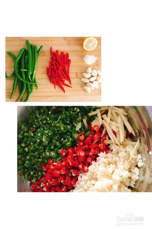 米椒、线椒、蒜切碎,四片姜切成丝,把冰糖也搞碎了,如果你们家的是一粒一粒的就直接放,材料放盆里。