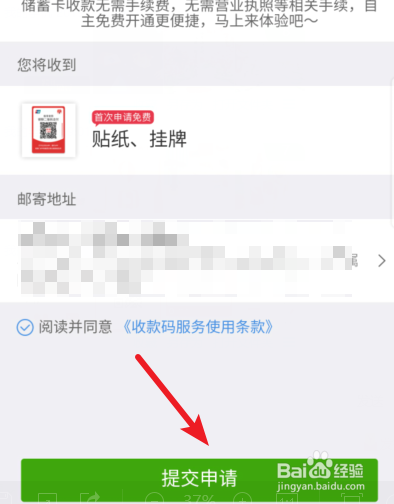 点击后,下方会出现商户收款的选项。我们点击进入收款码贴纸申请界面。