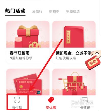 我们解锁手机后,选择云闪付的应用进入。进入后,点击下方的收付款的选项。