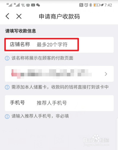点击后,在申请商户收款码的界面,我们填写自己的店铺名称及收款卡号,点击下一步。