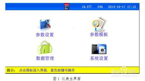 仪表开机后显示“参数设置”、“参数模板”、“数据管理”、“系统设置”四个模块。