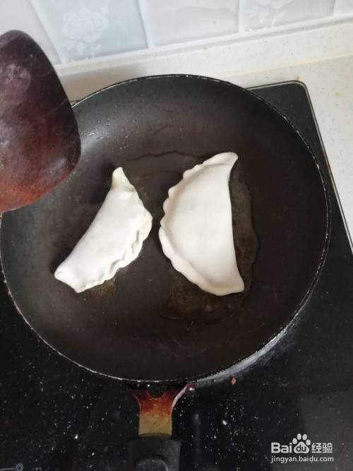 今天就讲如何烙韭菜盒子。平底锅里放少量豆油,点火烧热,让油将锅底涂满,放入包好的韭菜盒子。