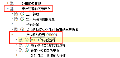 点击'物料管理',展开子项,选择'库存管理和实际库存' —>'货物移动设置' —>'MIGO的字段选择' ,点击执行