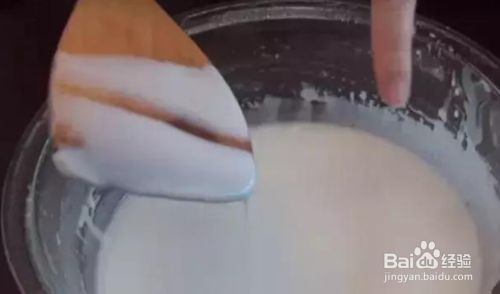 碗放入煮开的水中,一边不停搅拌,至面液有一点粘稠即可拿出,判断的方法如下图,用平铲沾上一层面液后用手轻轻划一下,可划出清晰的断层就是可以了,这一步一定不要加热过度。