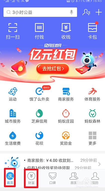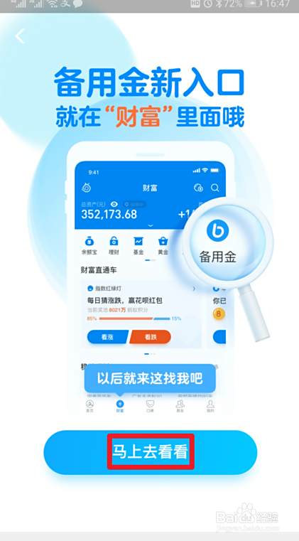 以后只需要找支付宝首页,点击下方的【财富】,再点击【财富】,在财富界面的右上角就看到【备用金】。二步即可找到。
