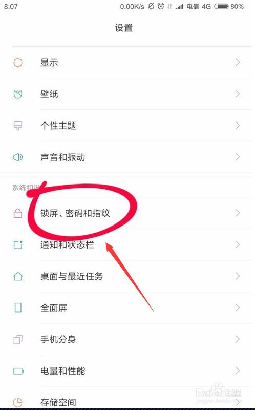 然后在手机的设置界面选择“锁屏、密码和指纹”选项,如图所示。