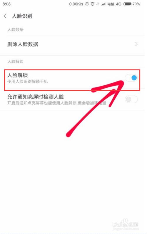 最后将“人脸解锁”一栏的开关开启即可,如图。