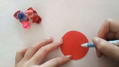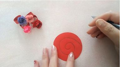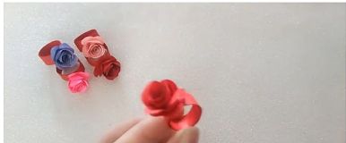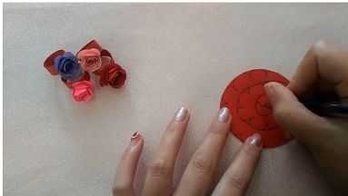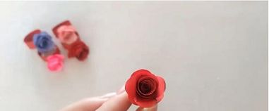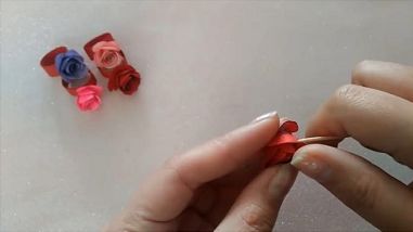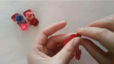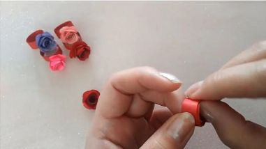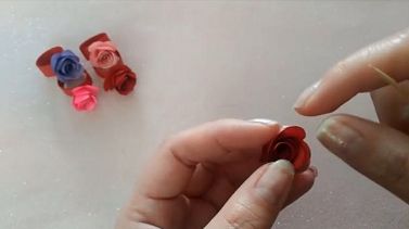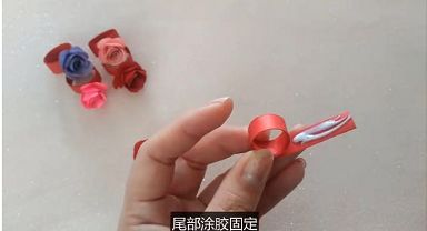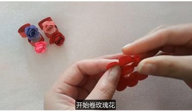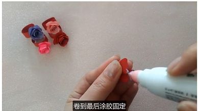 我们开始卷玫瑰花,卷到一半时候用胶水固定下。继续卷直到全部卷好,用胶水粘牢