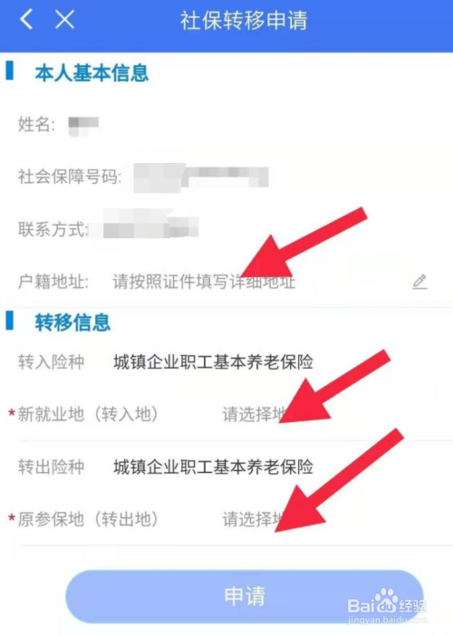 第四步:进入社保转移申请页面,输入本人基本信息,然后点击“申请”即可。
