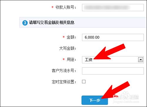 输入员工的账号、应付工资,用途处输入工资,点击下一步。