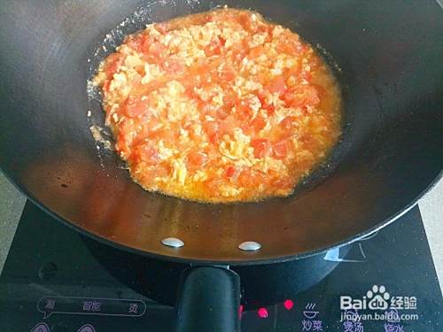 炒锅加入油烧至六成热,加入番茄炒几下,均匀铺满鸡蛋液。