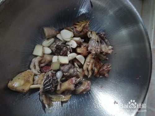 炒变色后,加入事先准备好的蒜瓣、生姜,翻炒。