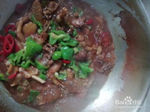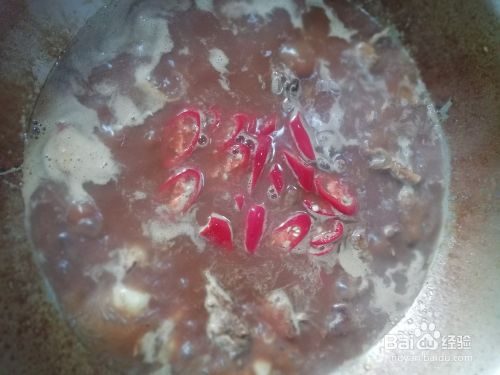 煮十五分钟后,检查水量。加入红尖椒,继续煮。