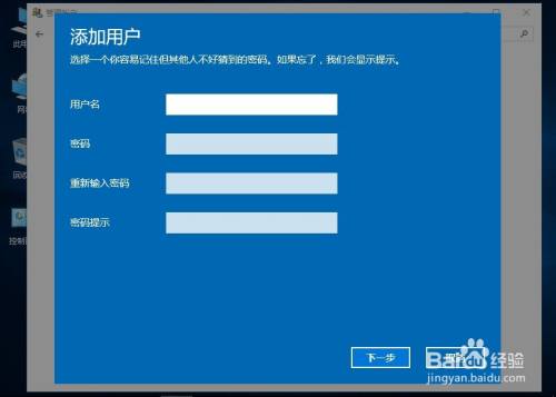 输入用户名,密码等,点击“下一步”,再点击“完成”。新账户就建好了。