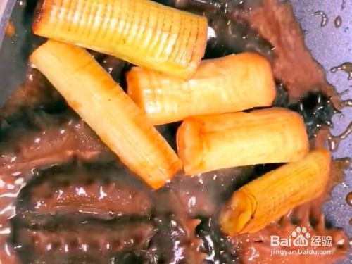 锅留底油,倒入海参,大火炖3分钟,再收一收汤汁。