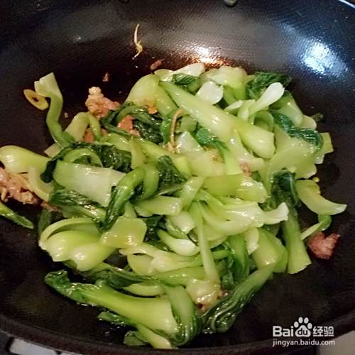 放入油菜煸炒,放入盐,生抽煸炒。