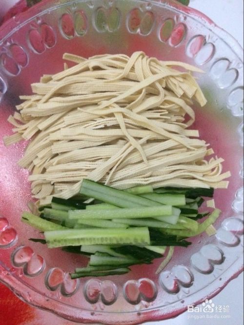 捞起后,凉一会,不烫手后把豆腐皮切成细细的丝;然后把黄瓜洗干净,也切成丝;把切好的豆腐皮丝和黄瓜丝放在一个大碗里,