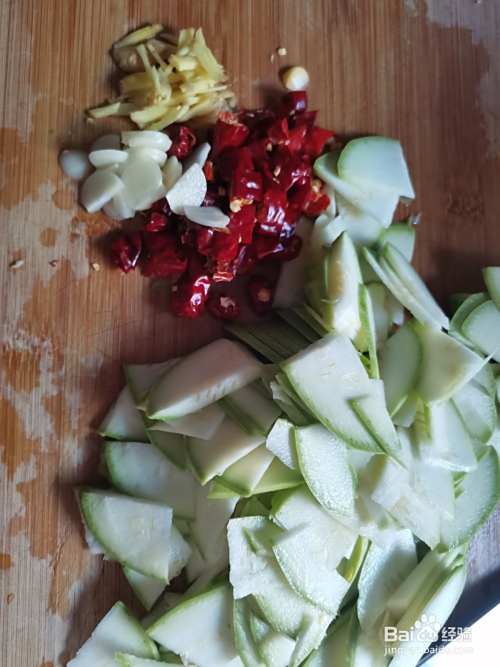 把小瓜洗净切成薄片,干辣椒切成节,大蒜切成片,生姜切碎。