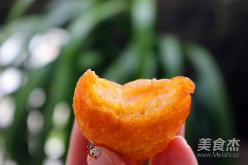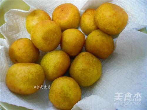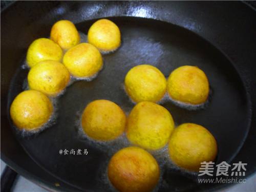 7热油锅,油温烧至8成高,冒气泡时,放入南瓜丸子,中火炸1分钟左右,用筷子拌一下南瓜丸子,让其表面受热均匀,色泽统一,炸至南瓜丸子表面金黄色