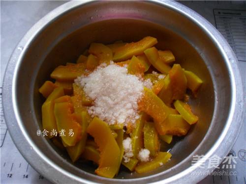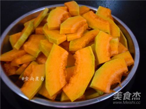 1南瓜切开,掏出南瓜籽,去皮洗净,切薄片,上锅蒸熟,用筷子插一下,轻轻能插入南瓜片中,表示已经熟透