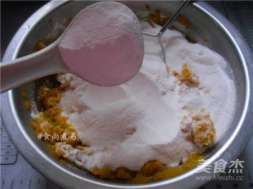2蒸熟的南瓜倒入大盆中,趁热加入白糖,少许盐、用工具捣烂成南瓜泥