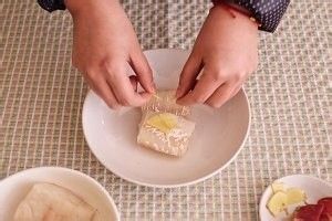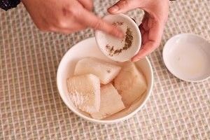将料酒倒入鳕鱼片中,撒适量盐抹匀,腌制半小时