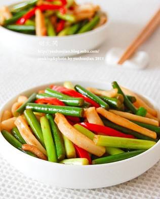 3炒锅加油烧热,放入蒜苔略炒断生;