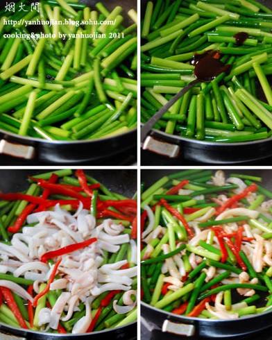 这是很快就可以完成的一道菜,小鱿鱼很嫩,也很容易熟,汆烫的时间要短,炒的时候也要快,否则肉质变硬就不好吃了。
