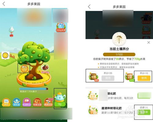 进入之后可以需要积累水滴才能果树成长,点击“养分”时需要施肥的任务才增加养分,通过邀请等任务可以获得化肥.
