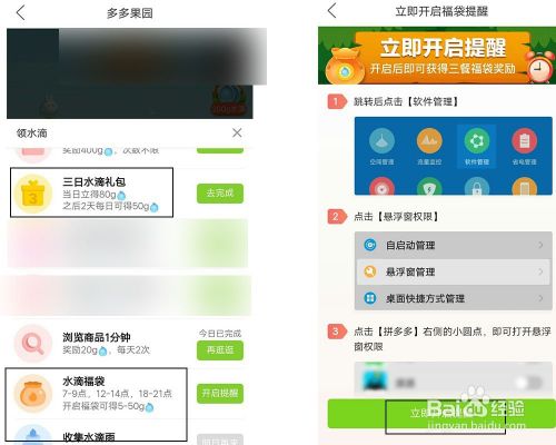 如果想让果园成长的话需要点击“领水滴”可以“连续三日时可以获得水滴礼包”或者可启“水滴福袋”可以提醒领水滴.