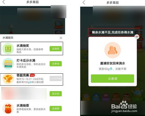 也可以点击“水滴娱乐”时通过“水滴抽奖或答题竞赛”有时间的限制可以获得不等的水滴,如果水滴不足时可以邀请好友回来浇水,可以获得50g水滴,次数不限