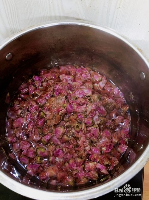玫瑰花放进锅里,加清水煮,煮到玫瑰花瓣颜色泛白即可。
