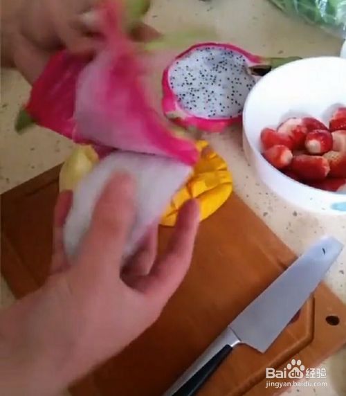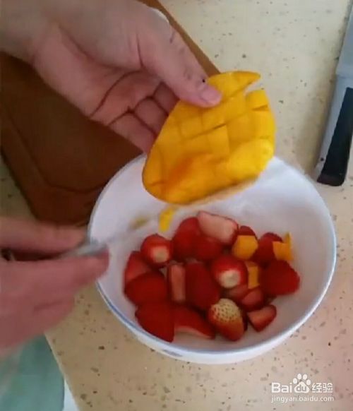 第二,把芒果洗净,切开,果肉切到放草莓的容器里面,具体操作如下图: