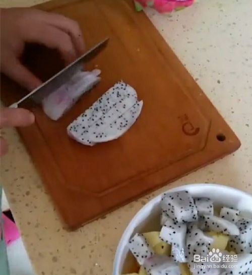 第三,火龙果洗净,切开剥皮,如下图所示,切成均匀的块状,放到容器里面: