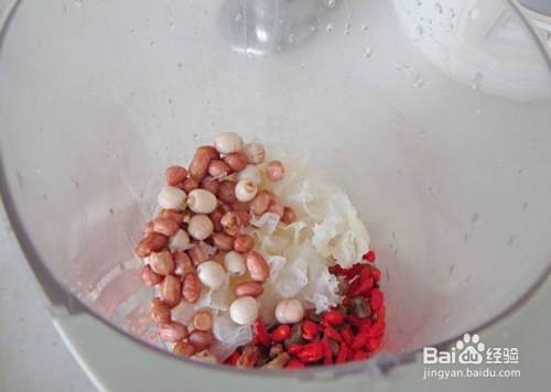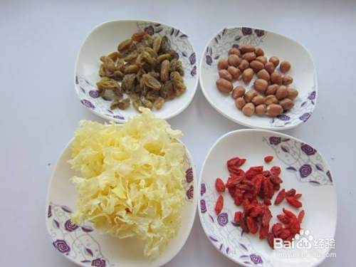 主料:枸杞、莲子、花生 辅料:银耳、葡萄干、白糖