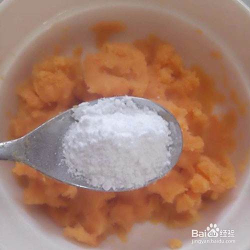 再放到碗里捣成泥,加入一勺的糖粉、少许的牛奶搅拌均匀。