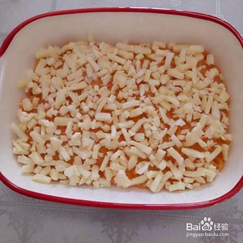 然后放入容器里摊平,再把芝士切成小粒放到地瓜上面摊匀。