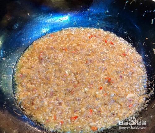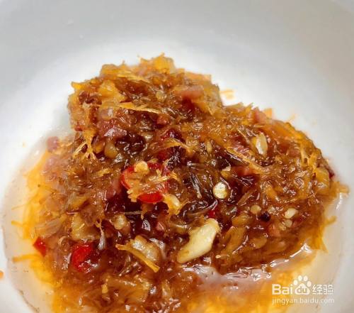 再将瑶柱、虾干、培根放进去,根据跟人口味,适量放入辣椒,最后倒入调制好的酱料