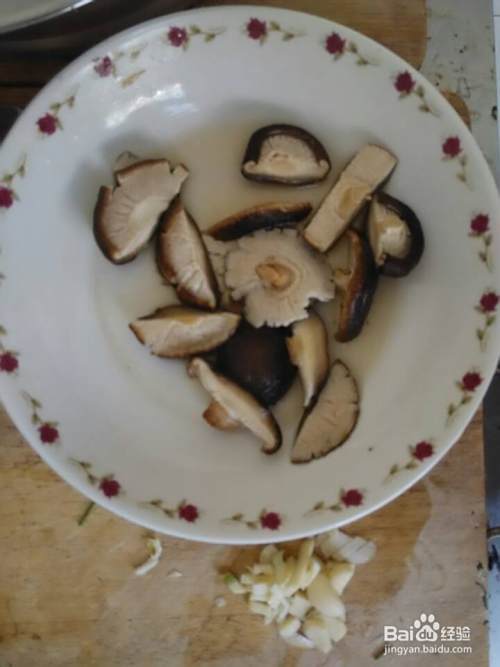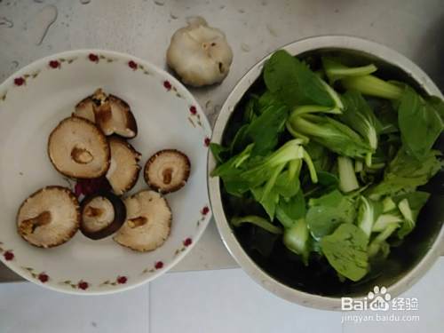 准备好适量的香菇和油菜以及蒜,如下图,把蒜切末。