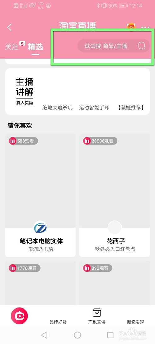 在淘宝直播页面中,点击上方的搜索框。