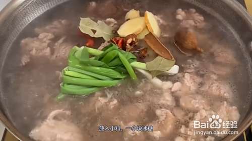 起锅烧水,牛肉冷水下锅,大火烧开锅,撇去浮沫,放入小料、一小块冰糖,中小火炖50分钟。