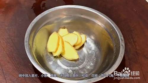 牛肉洗净后切成大块,碗中放入姜片、小葱、草果、干山楂、香叶、桂皮、花椒、两个八角、干辣椒段。