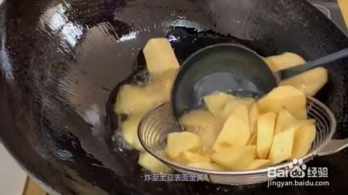 土豆切成块,洗净控水备用,西红柿切成小块,起锅烧油,放入土豆块,炸至土豆表面金黄,捞出控油。