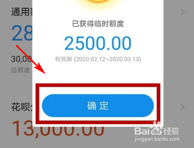 最后我们点击【领取】,然后点击【确定】,这样我们花呗的临时额度就领取成功了。